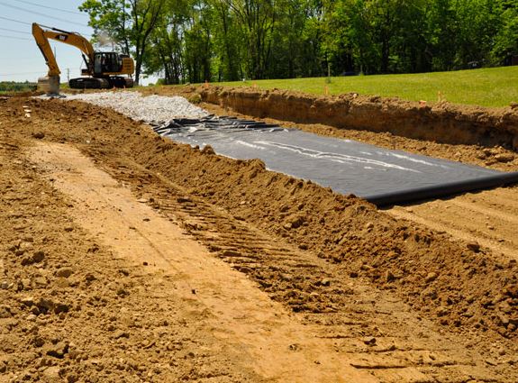 - Укладка геотекстиля. На подготовленную поверхность рабочие раскатывают плотное геотекстильное полотно. Оно предотвращает смешивание щебня с грунтом и увеличивает несущую способность основания. Полотно укладывают с нахлёстом, чтобы обеспечить сплошной защитный слой.